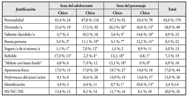 A continuación, se exponen las justificaciones de los adolescentes en relación con los personajes de cada serie y se aportan únicamente aquellas motivaciones que han sido señaladas por más del 5 % de los adolescentes.2 Dichas justificaciones se han relacionado, en primer lugar, con el género de la audiencia y, en segundo lugar, con el género de los propios personajes.