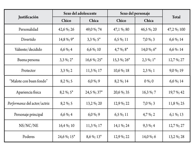 Las chicas justifican más que los chicos su elección por la “apariencia física” (χ² = 7,272; gl = 1; p= 0,007), mientras que los chicos por el “poder” que tiene el personaje (χ² = 9,680; gl = 1; p= 0,002).
