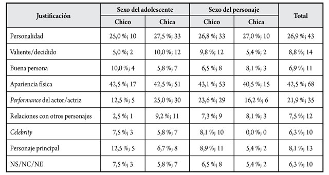 Por otra parte, observamos que la apariencia física de los personajes es un factor muy importante para la elección, hecho que desvela la relevancia que el físico tiene en la etapa adolescente y en la construcción de la identidad. Las chicas son delgadas y guapas y los chicos musculosos y atractivos, como ya destacaban estudios anteriores (Barriga, Shapino y Jhaveri, 2009; Mastro y Ortiz, 2008, entre otros).