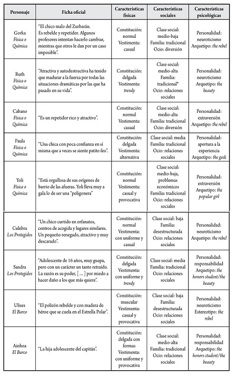 Los nueve personajes analizados (tabla 6), todos ellos protagonistas, ejemplifican, en su mayoría, los dos modelos -masculino y femenino- encontrados en el estudio general: adolescentes de raza caucásica, heterosexuales, de constituciones delgadas (las chicas) o normales (los chicos), clase media o medio-alta, procedentes de familias tradicionales, volcados en sus relaciones sociales y con personalidades complejas, entre las que destaca el neuroticismo (sobre todo de los chicos) y apenas aparece la responsabilidad (que es más el caso de las chicas).