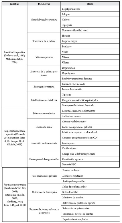 Según la literatura científica reciente ya descrita sobre la materia, proveniente de las bases de datos Web of Science (WOS) y Scopus, se determinó una propuesta inicial de las variables, los parámetros y los ítems que deberían estar presentes en forma de contenidos en las sedes web de las cadenas hoteleras. En el trabajo, se plantea una única variable dependiente, que se corresponde con el objeto de estudio (la gestión de las marcas de cadenas hoteleras a través de sus sedes web corporativas). Asimismo, se establecieron tres variables independientes, que determinaban la anterior: identidad corporativa, RSC y reputación corporativa (Luengo, 2015). A su vez, dentro de las variables independientes, se establecieron sus correspondientes parámetros, entendidos como aquellos aspectos que componen cada variable (Merlo, 2003). Para lograr un estudio más detallado, cada parámetro se dividió en una serie de ítems que recogen las dimensiones específicas por considerar en cada caso.