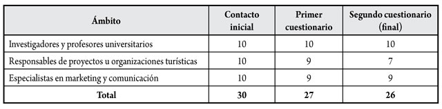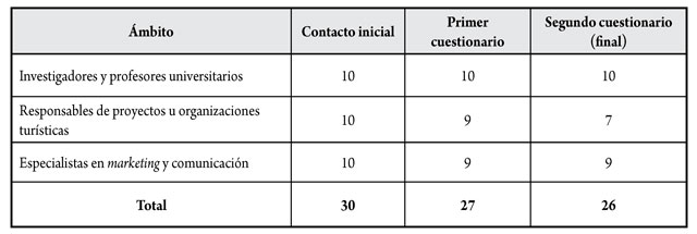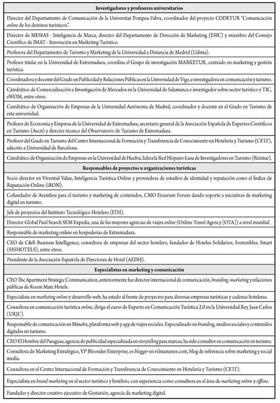Se eligieron dichos grupos debido a su amplio vínculo con el sector turístico y hotelero, así como poder arrojar luz sobre el objeto de estudio desde múltiples perspectivas, lo que enriquece la investigación y, además, evita sesgos que podrían producirse si el panel estuviera constituido por los propios departamentos de comunicación de las cadenas hoteleras.