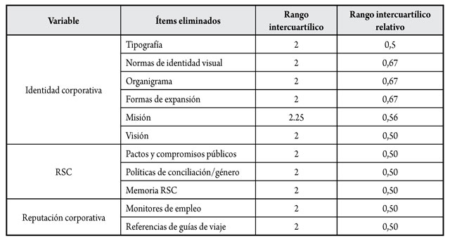 Se procedió a la aplicación del método Delphi como una metodología cualitativa que permitiera depurar los parámetros e ítems previamente establecidos para cada variable, con el fin de establecer aquellos que parecían más adecuados para la comunicación de la marca en el entorno de las sedes web de las cadenas hoteleras. Para valorar cada ítem, se estableció una escala de Likert de cinco puntos. Con el fin de determinar la relevancia de un ítem, se consideró que este tendría que obtener una puntuación media de 2,5 o más, de modo que 5 es el valor máximo posible. Los resultados de los cuestionarios fueron analizados a través de medidas estadísticas de tendencia central, por ejemplo, la mediana (Me) y de posición, como los cuartiles (Q1, Q2 y Q3). Estos permitieron revelar información acerca de la distribución de las respuestas del grupo de expertos. Asimismo, se emplearon medidas de dispersión como el rango intercuartílico (RI) y la desviación típica. Como criterio de medida del grado de consenso, se consideró el rango intercuartílico relativo. El rango intercuartílico relativo (RIR = Q3 - Q1/Me) reveló el grado de dispersión de las respuestas entre los expertos para cada variable, parámetro e ítem. El grado de estabilidad (criterio para la finalización del proceso) se obtuvo utilizando como indicador la variación del rango intercuartílico relativo (Vr) de la distribución de las respuestas.