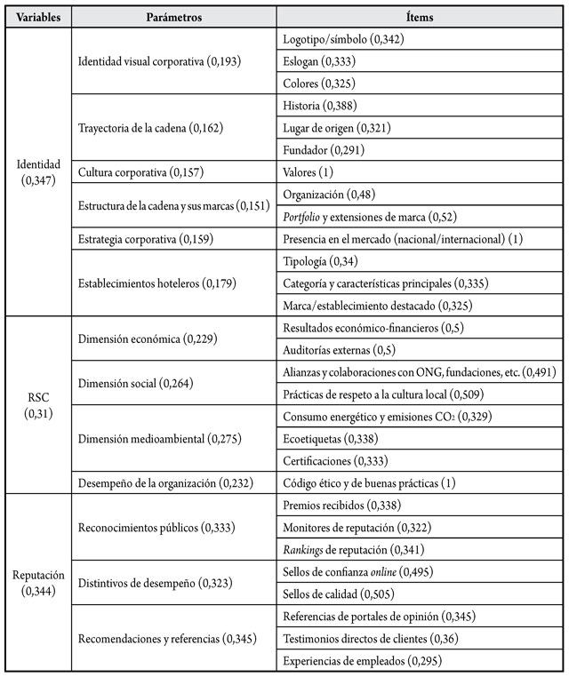 El modelo incluye para cada variable, parámetro e ítem el coeficiente de ponderación que prioriza a unos ítems sobre otros. El objetivo de la ponderación fue determinar con precisión el valor de cada elemento tanto a la hora de planificar la gestión de la comunicación como de llevar a cabo un análisis de la comunicación de los mensajes de marca de las cadenas hoteleras a través de sus sedes web.