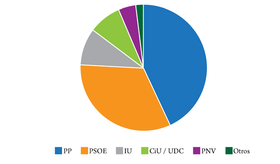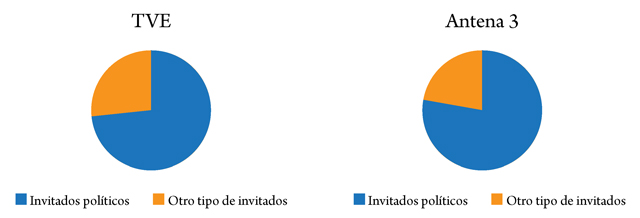 Así se entrevistaron mayoritariamente a miembros del PP (67) y del PSOE (51). Cabe destacar que no hay apenas diferencia entre el porcentaje de estas que llevó a cabo un canal u otro: en el caso del PP, un 49,25 % corresponden a TVE y un 50,75 % a Antena 3. En el del PSOE, un 47,06 % pertenecen a la cadena pública y un 52,94 % a la privada.