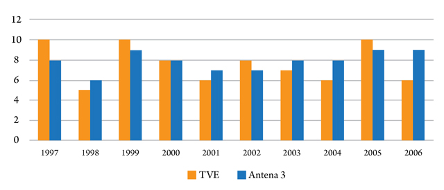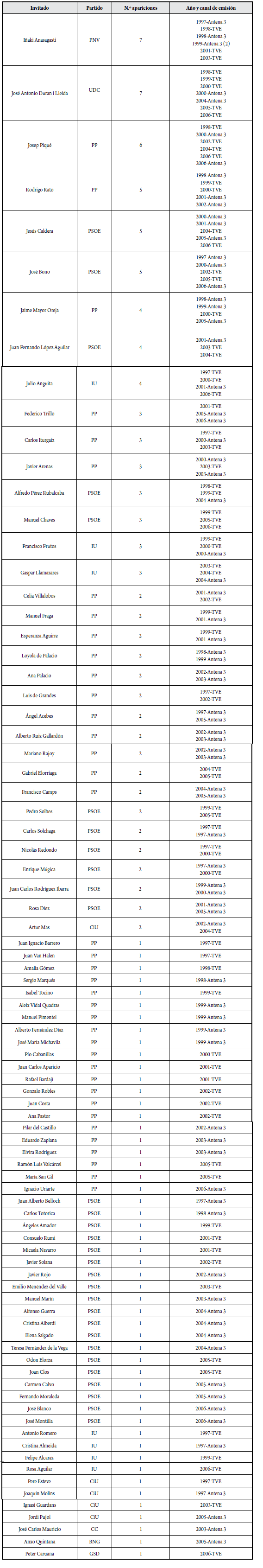 Tanto la cadena pública como la privada cedieron minutos de sus programas para entrevistar a personas destacadas, para completar el contenido de estos espacios centrados en debatir la actualidad política con tertulianos habituales procedentes principalmente del ámbito periodístico, como hemos visto. Entre 1997 y 2006, se han registrado 206 entrevistas distribuidas de manera muy equilibrada entre las dos cadenas objeto de estudio: 104 en el caso de TVE y 102 en Antena 3 (tabla 2).