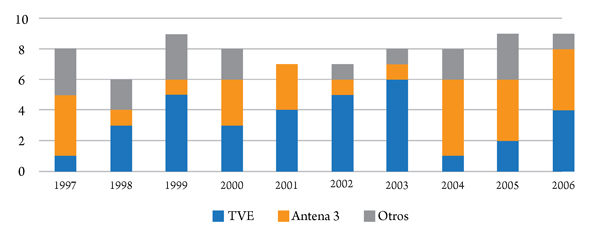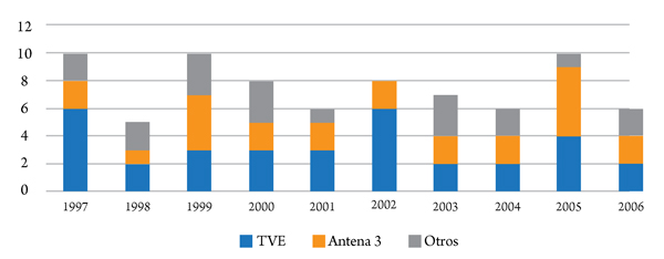 Desde un punto de vista longitudinal, la cantidad de entrevistas en relación con las fuerzas políticas no ha sido homogénea durante todo el periodo analizado. Los años en los que más entrevistas a políticos se han registrado en total han sido 2003 y 2006, seguidos de 1999 y 1997. En atención a la subdivisión por cadenas, TVE varía más el número por año en sus matinales mientras que Antena 3 muestra muchas menos variaciones a lo largo del periodo objeto de estudio (figura 2).