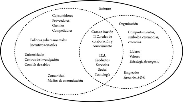 Es decir, aunque existen varios aspectos que deben mejorar, identificados por entes como el Consejo Privado de Competitividad (CPC),4 el Departamento Administrativo de Ciencia, Tecnología e Innovación (Colciencias)5 o la propia ANDI, este trabajo se orienta a determinar los asuntos en los que se puede incidir desde la comunicación, en lo que atañe a los elementos de la organización y su entorno, que entran a desempeñar un papel protagonista cuando se busca establecer y fortalecer relaciones estratégicas con grupos de interés, como se contempla en la implementación de modelos de ICA. Estos últimos vienen imponiéndose como consecuencia de las posibilidades que han generado los desarrollos tecnológicos, la globalización y las nuevas prácticas para compartir el conocimiento, las cuales, como aquí se expone, se soportan en buena medida en la comunicación para materializarse.