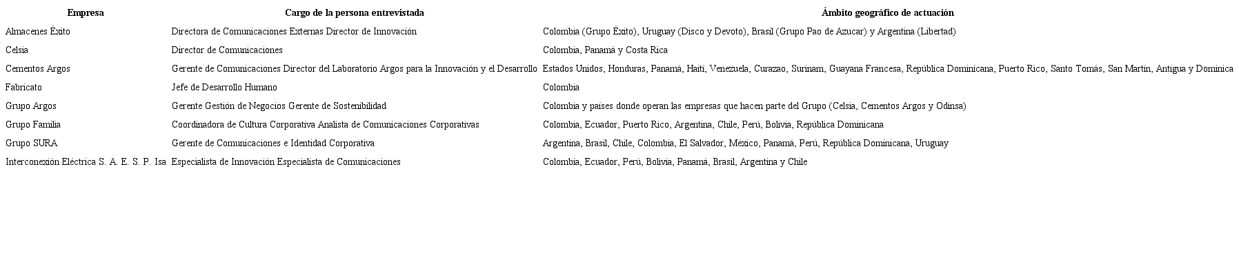 En este artículo se presentan los resultados que arrojaron las entrevistas realizadas con ocho de ellas que tienen su casa matriz en el departamento de Antioquia, pero sus operaciones se desarrollan en diversos países de América Latina. Si bien todas se originaron en esa región de Colombia, algunas de ellas cuentan con capital extranjero (Almacenes Éxito, Grupo Familia). Las únicas compañías de esta región que accedieron a atender las entrevistas hacen parte de la muestra final que se presenta en la tabla 2. Allí mismo se incluyen los perfiles de las personas que participaron en la investigación y los ámbitos geográficos de actuación de las compañías.