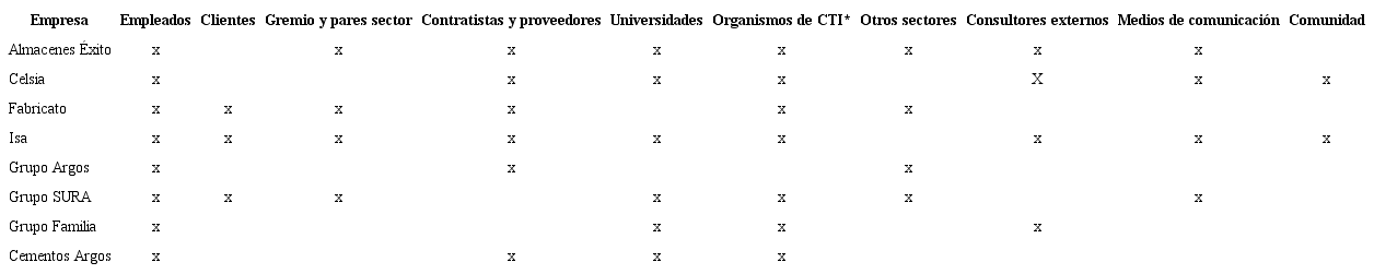 En las entrevistas, se consultó de manera puntual por los grupos de interés con los que se desarrollan actividades de innovación conjunta, para identificar si estos procesos merecían clasificarse como ICA. Al analizar la información recabada, los consultados coinciden en que la mayor parte de las relaciones que se establecen con grupos de interés externos a la organización, respecto de la colaboración abierta orientada a la innovación, son los “actores lógicos del ecosistema de innovación” (Cementos Argos, comunicación personal, 10 septiembre 2018), para referirse a proveedores, universidades, redes en las que participan, laboratorios o centros de investigación y pensamiento, y no tanto a los clientes, la comunidad en general o los competidores.
