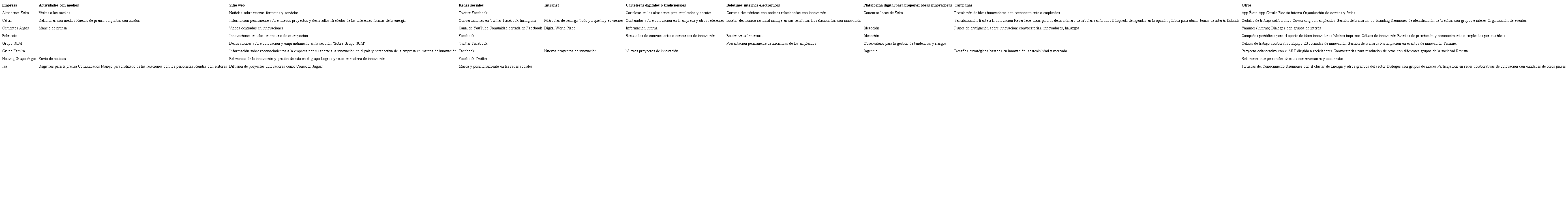 En la tabla 3, se presenta una relación entre las empresas y los grupos de interés con los que las organizaciones consultadas mantienen un intercambio mayor de conocimiento en asuntos que atañen a la innovación.