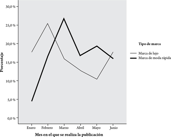 Por su parte, las marcas de lujo en general prefieren publicar en febrero (25,5 % de los posts efectuados por estas empresas), de esta forma Hugo Boss cuenta con el 36,6 % de todas publicaciones realizadas ese mes y Ralph Lauren posee el 18,8 %. Al contario de lo que ocurre con las organizaciones de moda rápida, mayo es el periodo menos utilizado por la industria del lujo (10,5 %). Cabe destacar que las diferencias halladas en los meses de publicación en función del tipo de marca son estadísticamente significativas (x2 = 39,137, p = 0,000).