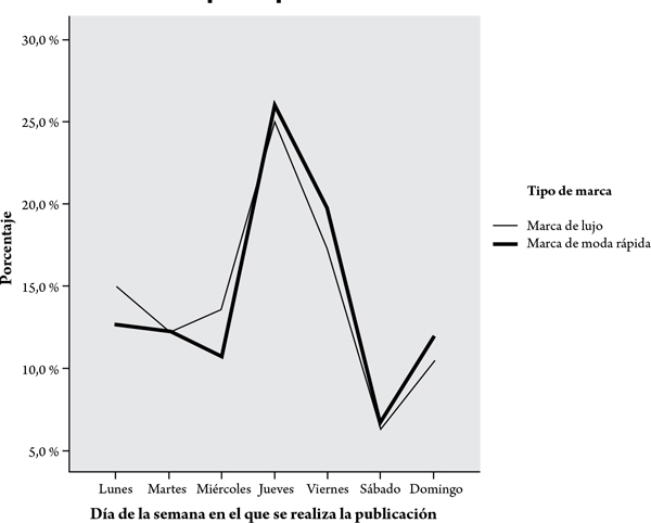A diferencia de lo que ocurre en el caso anterior, parece que sí existe consenso entre el tipo de marca y el día de la semana en el que se realiza la publicación, ya que no se producen desemejanzas (x2 = 1,987; p = 0,921). De esta forma, los jueves son los días más prolíficos, seguido de los viernes y de los lunes (25, 17,3 y 15 %, respectivamente, del total de posts elaborados por las organizaciones de lujo y 26, 19,7 y 12,6 % de los de moda rápida). Además, no se suelen realizar publicaciones los sábados (6,4 % de los posts realizados por las empresas de lujo y 6,7 % de los efectuados por el sector fast fashion). Por tanto, y como se puede observar en la figura 2, las organizaciones analizadas no suelen prestar atención a Facebook los fines de semana, ya que prefieren los últimos días de diario.