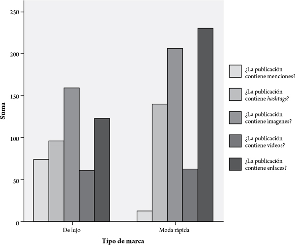 Con referencia al idioma, cabe destacar que las empresas examinadas realizan sus publicaciones principalmente en inglés (96,8 % de los posts efectuados por las organizaciones de lujo y 95,5 % de las catalogadas como fast fashion), de manera que no se producen diferencias estadísticamente significativas entre el tipo de marca (x2 = 8,292; p = 0,505). De esta forma, se evidencia la preferencia que poseen las organizaciones de moda hacia el inglés para comunicarse con un público internacional que presumiblemente posee diversas lenguas maternas.