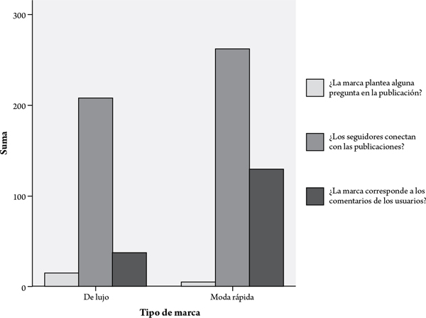 No obstante, parece especialmente relevante prestar atención a las variables relacionadas directamente con el diálogo y la interacción, ya que las redes sociales se caracterizan por facilitar la comunicación bidireccional (Aced, 2013, p. 153) entre la organización y sus públicos. De esta forma, aunque los seguidores de las marcas de moda estudiadas han mostrado interés en dialogar, se podría considerar que las organizaciones examinadas, especialmente las de moda rápida, no están explotando las posibilidades de interacción que ofrece Facebook al no introducir de manera habitual preguntas en sus publicaciones, estrategia que invita directamente a los seguidores a ofrecer una respuesta (Huertas, Setó-Pàmies y Miguel-González, 2015, pp. 17-18).