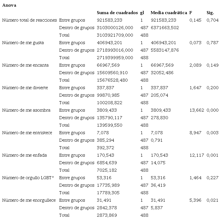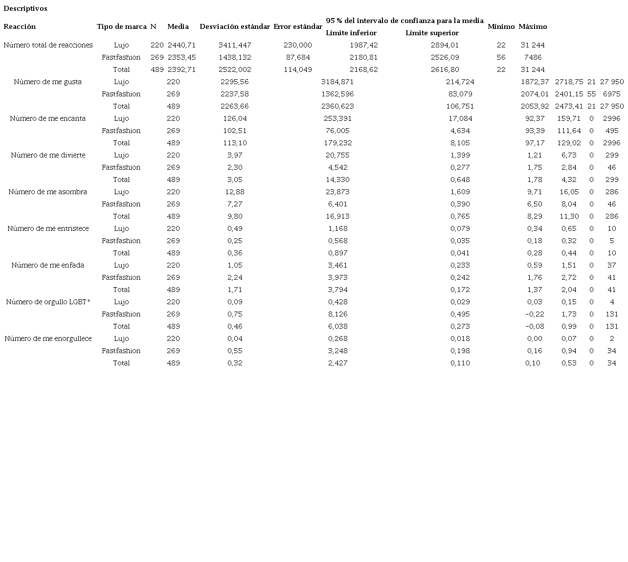 Al considerar el número total de reacciones que los seguidores incluyen en las publicaciones, cabe destacar que no se producen diferencias entre los tipos de marcas (F = 0,145, sig. = 0,704). De esta forma, las organizaciones de lujo poseen una media de 2440,71 reacciones por post (mínimo 22; máximo 27 950), cifra que se reduce a 2392,71 en el caso de las empresas de moda rápida (mínimo 56; máximo 4586). Sin embargo, hay algunos botones de reacción específicos que sí producen desemejanzas, a saber: "Me asombra" (F = 13,662, p = 0,000), "Me entristece" (F = 8,947; p = 0,003), "Me enfada" (F = 12,117; p = 0,001) y "Me enorgullece" (F = 5,396, sig. = 0,021). Así, la media de las instituciones de lujo es superior a la del sector fast fashion en los dos primeros botones e inferior en el resto (tablas 1 y 2). Por tanto, se trata de dos reacciones positivas y dos negativas para cada tipo de marca, de manera que se podría afirmar que las organizaciones de moda rápida y las de lujo despiertan el mismo tipo de emociones.