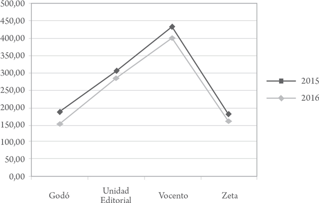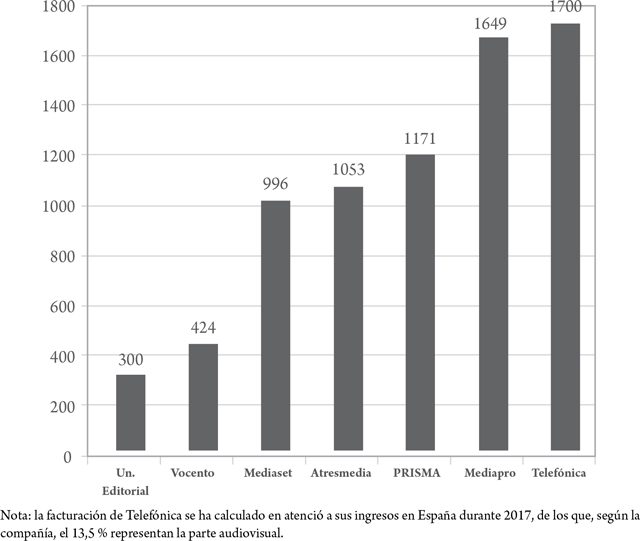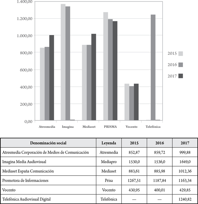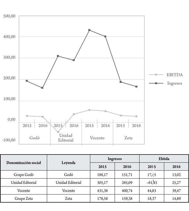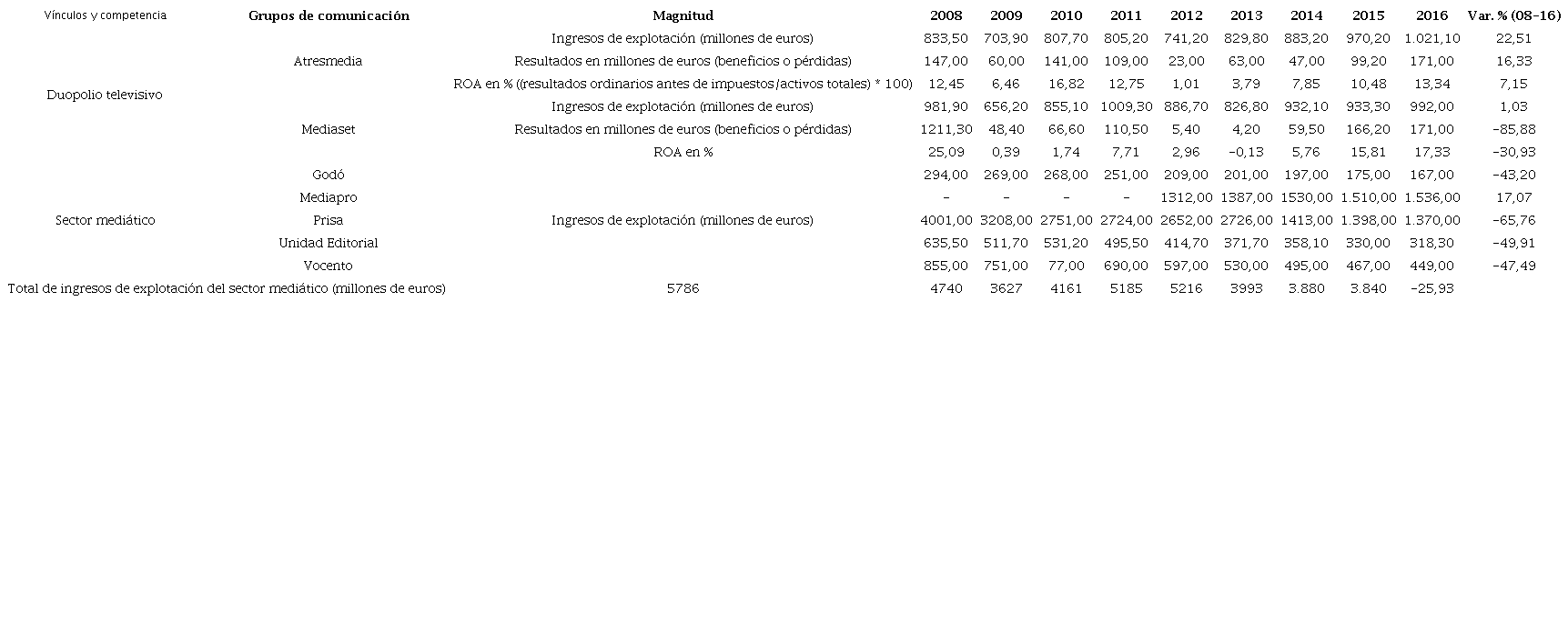 Por su parte, el resto de los principales grupos presentes en el sector mediático, y durante el periodo 2008-2016, han visto cómo sus ingresos de explotación se han reducido en un 25,93 %. La excepción de este grupo la representa Mediapro, que en el periodo 2012-2016 incrementó sus ingresos de explotación en un 17,07 %.