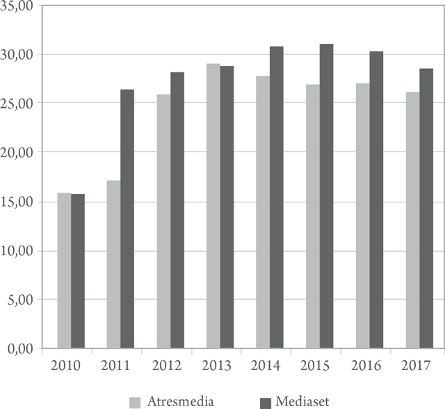 Así, y mientras que buena parte de los grupos multimedia españoles atravesaban una delicada situación financiera, Mediaset España y Atresmedia se situaban en una posición envidiable en relación con sus competidores que ganaron entre 2007 y 2017 EUR 2300 millones en beneficios. Un hecho que no hubiera sido posible sin la retirada de publicidad de RTVE tras su nueva y restrictiva ley de financiación (Ley 8/2009, de 28 de agosto de 2009) y su abandono de algunos derechos de retransmisión de grandes eventos deportivos.