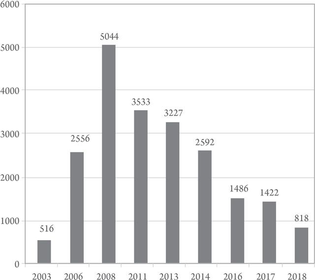 En otro orden de cosas, los grupos de comunicación surgidos tras los excesos de los años de bonanza (años de financiarización y de endeudamiento excesivo) y las consiguientes correcciones de los años de la crisis han dejado una gran cantidad de damnificados, con unos grupos más ligeros de activos (para satisfacer sus deudas bancarias) y una crisis tan enorme que (como demuestra el tabla de la inversión publicitaria entre 2007 y 2017) ha llevado a que la prensa española haya disminuido su inversión publicitaria de EUR 1894 millones en 2007 a solo EUR 567 millones en 2017, tres veces menos (figura 2).