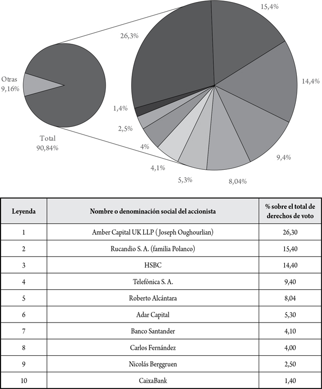 La otra consecuencia importante es que ha pasado de tener a los Polanco, familia fundadora del grupo, como socio mayoritario a poseer solo el 15,4 % del capital (CNMV, 2018), mientras que fondos de inversión y bancos, que se vieron obligados a convertir deuda financiera en acciones de la compañía, ya controlan el 54 % (aparte del 9,4 % de Telefónica), un proceso claro de financiarización (Jivkova y Pérez, 2015), que no solo compromete la independencia del grupo, sino también su futuro.