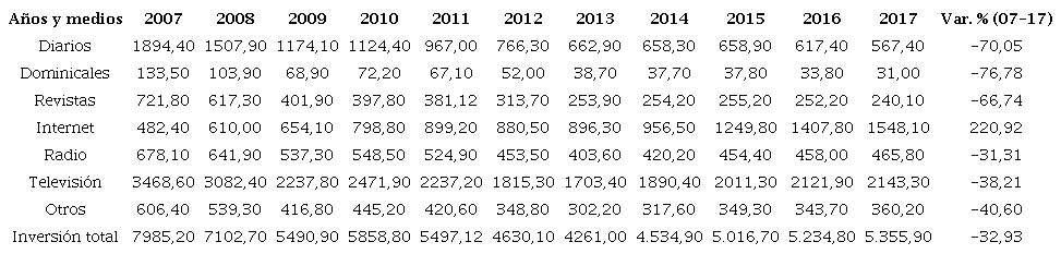 Así, todos aquellos grupos que en su día perdieron el control de alguna televisión generalista (Grupo Zeta y Godó), o no fueron capaces de poner en marcha un gran canal televisivo (Vocento, Unidad Editorial y Prensa Española), o fracasaron en el desarrollo de una televisión de pago (Prisa) quedaron fuera de la competición mediática (figura 1) y permanecen, ahora, aferrados a un sector en crisis como el de la prensa que, entre 2007 y 2017, ha experimentado un descenso del 70 % en la publicidad contratada (tabla 1) y una merma en sus ingresos, superior en euros constantes al 50 %, por no mencionar los profundos déficits en sus transformaciones digitales, la pérdida de calidad periodística y de su centralidad como diarios de referencia.