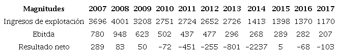 Por otra parte, la empresa experimentó una reducción significativa de su tamaño empresarial al ir desprendiéndose de empresas y participaciones en otras compañías. Así, de unos ingresos de explotación de EUR 4001 millones en 2008 pasó a tan solo EUR 1170 millones en el ejercicio 2017, casi cuatro veces menos, con la consiguiente reducción de su Ebitda de EUR 780 a EUR 207 millones.