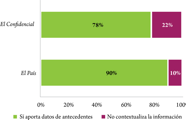 Si hay un subgénero que precisa de información contextualizadora, ese es el de la crónica en su modalidad internacional. El repertorio de datos referidos a los antecedentes de un hecho que el corresponsal despliegue en sus textos puede condicionar de modo decisivo la comprensión de los acontecimientos, habitualmente remotos, cuando no exóticos, que está trasladando a la audiencia. Como se muestra en la figura 1, la mayor parte de las piezas de los dos medios analizados ofrece background, en especial las de la cabecera de Prisa (90 %, 45 piezas). Levemente inferior es el dato de El Confidencial, en el que se contextualiza el 78 % de las informaciones (39 unidades).