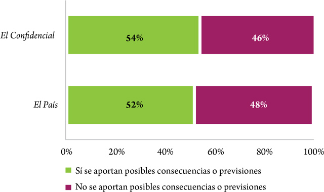 En tanto que la contextualización del hecho informativo se ha demostrado una práctica habitual en la confección de las crónicas de internacional, otro rasgo característico del género, la anticipación de escenarios futuros que pudieran derivarse de los acontecimientos actuales, no ofrece en el análisis un patrón definido, ya que tanto en El País como en El Confidencial la proporción de textos que incluyen previsiones apenas supera el 50 % de la muestra.