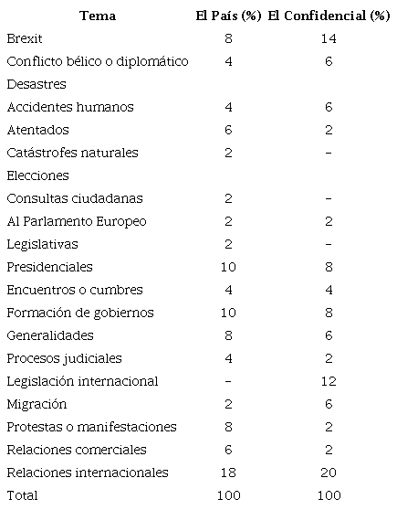 Los resultados del análisis indican la existencia de cuatro bloques temáticos destacados tanto en El País como en El Confidencial: política exterior en sentido amplio, procesos electorales de distinta envergadura, negociaciones encaminadas a la formación de gobiernos y, como único suceso singularizado de la escala, el brexit, cuestión omnipresente desde 2016 en el debate público europeo. Los cuatro ámbitos señalados destacan por su transversalidad, esto es, por el hecho de que, con muy pocas excepciones, implican a más de un Estado, lo cual incrementa lógicamente el interés periodístico que suscitan.