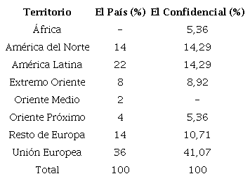 En materia geográfica, se constata que los países miembros de la Unión Europea (UE) son los que generan el mayor volumen de información internacional publicada por los medios analizados. Los asuntos procedentes de esta región centran el 41,07 % de las crónicas de El Confidencial y el 36 % de las de El País. Más concretamente, en ambos casos, la mayoría de las piezas abordan hechos acaecidos en Francia, Alemania, Italia y el Reino Unido, los cuatro países con mayor peso demográfico y económico de la UE.