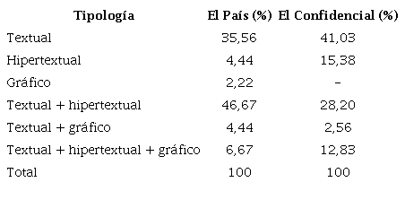 Como se ha apuntado ya, la hipertextualidad es uno de los rasgos definitorios del ciberperiodismo; históricamente es el primer recurso que se incorporó a los textos digitales y marcó la diferencia respecto de las versiones en papel. En la tabla 4, se refleja la inclusión de hipertextos en las crónicas analizadas. Si bien el dato del diario de Prisa es levemente superior al registrado por El Confidencial (6,68 ocurrencias por pieza frente a 6,02), en ambos casos se puede considerar muy similar el empleo de hipertextos, y no solo en términos cuantitativos, sino que también la naturaleza del material enlazado suele ser la misma.