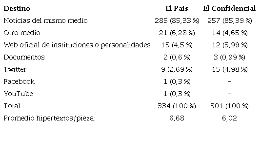 Lo habitual es que se utilicen para redirigir a noticias del mismo medio publicadas con anterioridad: así ocurre en 285 casos en El País (85,33 %) y en 257 en El Confidencial (85,39 %). Las otras modalidades más empleadas, aunque con una frecuencia de uso considerablemente menor, sirven para conducir al lector a informaciones aparecidas en otros canales o en páginas oficiales de instituciones, administraciones y personalidades de la esfera pública. En el primer caso, el objeto preferente de los hipertextos son medios de comunicación de los países donde suceden los acontecimientos, lo cual proporciona a aquellos lectores con la suficiente inquietud intelectual un saludable punto de vista alternativo que puede contrarrestar el tan denostado etnocentrismo del que con frecuencia se acusa a las crónicas publicadas por la prensa occidental. En muy raras ocasiones, los enlaces redirigen a otros medios españoles, no en vano competencia de El País y El Confidencial en la pugna por la captación de usuarios.