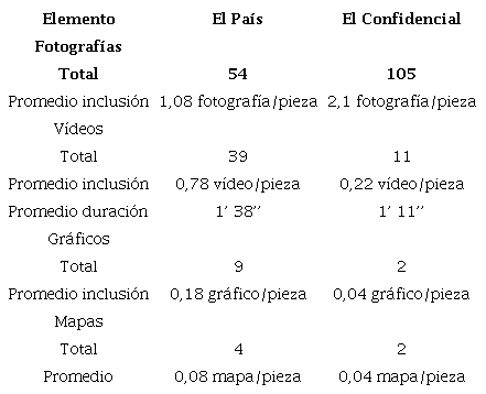 3. Elementos gráficos. Se incluyeron las variables relativas a los elementos paralingüísticos e icónicos (fotografías, vídeos, infografías, mapas, etc.) de las crónicas, figuraran incrustados en ellas o accesibles a través de enlaces hipermediales.