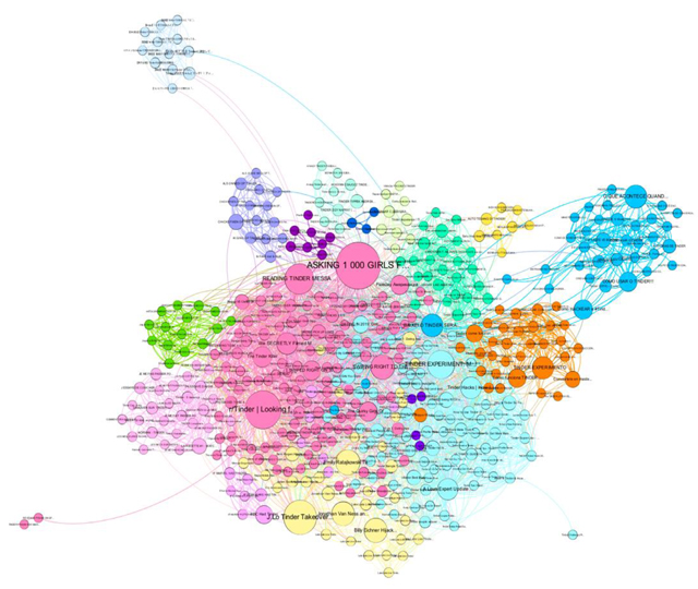 A rede de vídeos obtida era composta por 496 nós (vídeos) e 3.850 arestas (ligações). Ao grafo gerado, representativo da rede (Figura 1), aplicou-se o algoritmo modularidade. O objetivo foi quantificar o número de comunidades que formavam a rede, em função dos assuntos comuns tratados nos vídeos que as compunham (Hammer, 2018). Identificaram-se 17 comunidades. Entre estas comunidades eram abordadas temáticas tão diversificadas como a partilha de experiências resultantes do uso da aplicação - comunidade representada no centro da imagem em cor rosa - englobando abordagens como a construção de perfis, o processo de deslizar, a leitura de mensagens ou o relato de paródias. Informações sobre funcionamento - comunidade representada no centro da imagem a cor azul - em que se incluíam dicas sobre como iniciar uma conversa ou como destacar o perfil e conteúdos partilhados pelos media - comunidade representada na rede a amarelo claro.