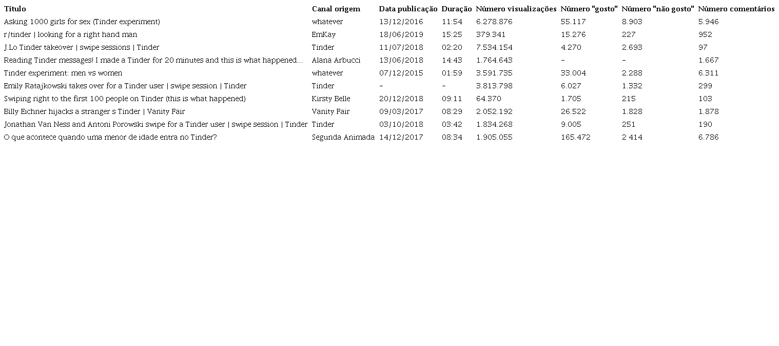 O Tinder revelou-se ser um objeto de atenção por parte de um conjunto heterogéneo de canais do YouTube e uma temática atrativa para a produção de conteúdo, do qual é reflexo o engagement que os vídeos em análise registaram.