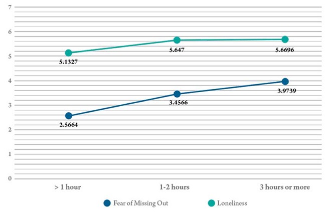 The post-hoc comparisons using the Tukey HSD test for Loneliness indicated that the mean score for spending less than one hour on Instagram (M = 5.13, SD = 1.65) was significantly different from 2-3 hours (M = 5.65, SD = 1.77). No statistically significant difference was observed in the mean scores obtained for spending between less than one hour and three hours or more on Instagram daily; or between 1-2 hours and three hours or more. This suggests that the more time you spend on Instagram daily the more loneliness you experience; that is, when 1-2 hours are spent on Instagram in a day, more loneliness is experienced as compared to spending less than one hour a day on Instagram. Therefore, the study rejects the null hypothesis and accepts the alternate hypothesis that the time spent on Instagram negatively affects FoMO and loneliness.