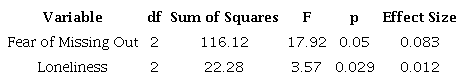 A one-way between-groups analysis of variance was conducted to explore the impact of time spent on Instagram on factors such as FoMO and Loneliness. Participants were divided into three groups according to the time spent on Instagram daily (less than 1 hour, 1-2 hours, and more than 3 hours). Table 2 shows a statistically significant difference at the p < 0.05 level for FoMO across the three-time distributions (F (2,398) = 17.92, p < 0.05). A statistically significant difference was also computed at p < 0.05 level for loneliness across the three-time distributions (where F (2,398) = 3.57, p ≤ 0.029).