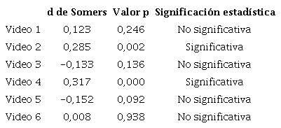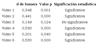 En los videos 1, 2 y 5 hubo una correlación positiva media entre la “activación” y la “intención de compartir”, que fue estadísticamente significativa (d = 0,348, p < 0,002; d = 0,441, p < 0,001 y d = 0,201, p < 0,05, respectivamente), mientras que en el 4 y 6 hubo una correlación positiva considerable (d = 0,590, p < 0,001 y d = 0,530, p < 0,001, respectivamente). Solo en el video 3 hubo una correlación positiva débil, que estadísticamente no fue significativa (d = 0,149, p > 0,05).