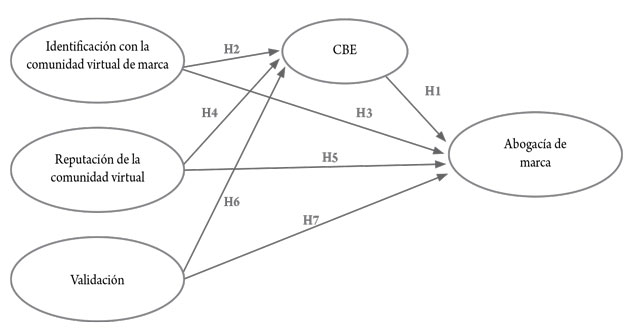 El estudio realizado por Mohanty y Dey (2020), en el contexto del comercio electrónico, también mostró que existe una estrecha relación entre el CBE y la abogacía. Finalmente, Wallace et al. (2014) sugieren que aquellos consumidores comprometidos con marcas en Facebook suelen tener comportamientos relacionados con la lealtad con la marca y su defensa. En consecuencia, teniendo en cuenta el contexto de comunidades virtuales de marca en redes sociales, se formula la siguiente hipótesis: