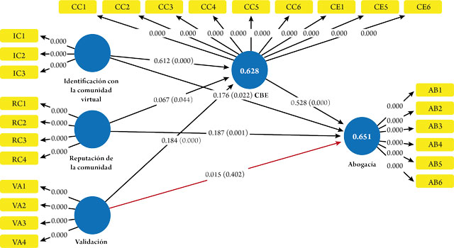 Por otra parte, se contrastaron H2 y H3. Se observó que existe un efecto directo y positivo de la identificación con la comunidad sobre el CBE (β = 0,612; p = 0,000) y sobre la abogacía (β = 0,176; p = 0,022). De igual manera, se aceptaron las hipótesis H4 y H5, donde la reputación de la comunidad tiene un efecto directo y positivo en la abogacía (β = 0,187; p = 0,001) y el CBE (β = 0,067; p = 0,044). Finalmente, la hipótesis H7 fue aceptada, al encontrarse un efecto directo y positivo de la validación sobre el CBE (β = 0,184; p = 0,000).