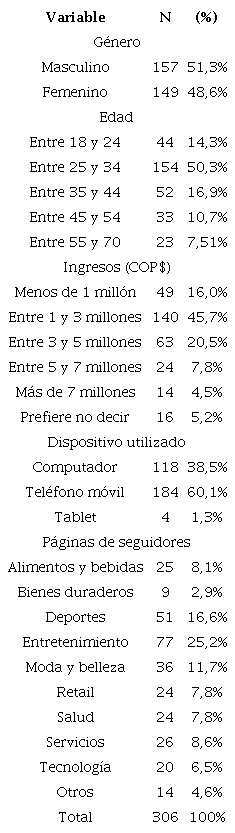 Se llevó a cabo una encuesta a 306 usuarios de Facebook en Colombia, mayores de 18 años, seguidores de, al menos, una página en esta plataforma. El acceso a los encuestados se realizó mediante la modalidad de panelistas. El uso de panelistas permitió garantizar las condiciones del perfil deseado para la aplicación de encuestas. No obstante, se realizaron algunas preguntas de filtro, como: ¿es usuario de redes sociales?, ¿tiene usted una cuenta activa en la red social Facebook?, ¿es seguidor de alguna página de marca en Facebook?, ¿ha participado en esta página en el último mes? Adicionalmente, se incluyó en el cuestionario una introducción acerca del concepto de página de seguidores (fanpage) y se solicitó a los encuestados responder las preguntas teniendo en cuenta su página de seguidores preferida en Facebook. La Tabla 1 describe las variables sociodemográficas de la muestra e incluye las frecuencias de las categorías de las páginas de seguidores indicadas por los encuestados. Esta clasificación de categorías de marcas se realizó a partir de cada una de las que los encuestados indicaron como favorita.
