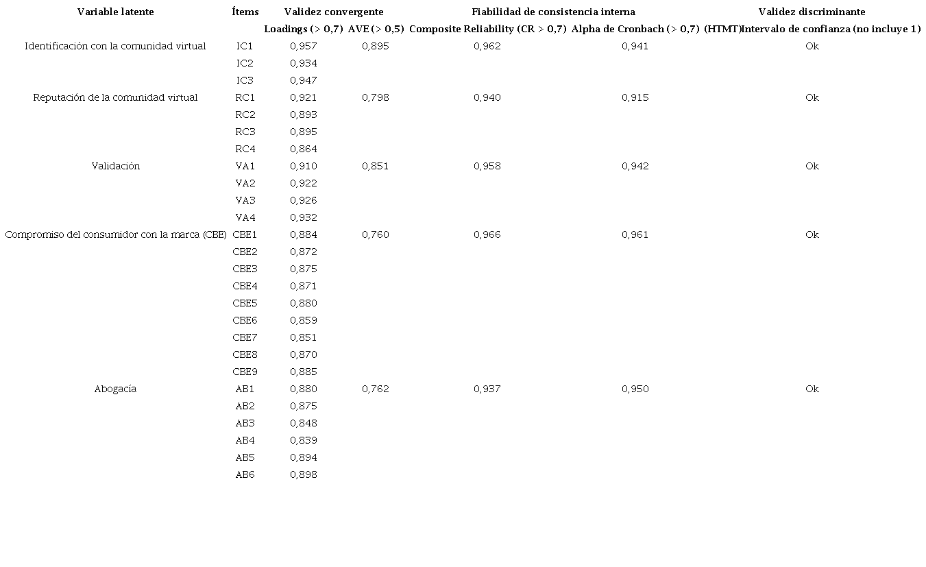 A la vista de estos resultados, se considera que el modelo de medición cumple con los requerimientos y es adecuado para examinar las relaciones entre la identificación con la comunidad de marca, la reputación de la comunidad, la validación, el CBE y la abogacía.