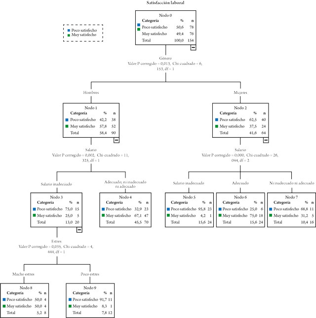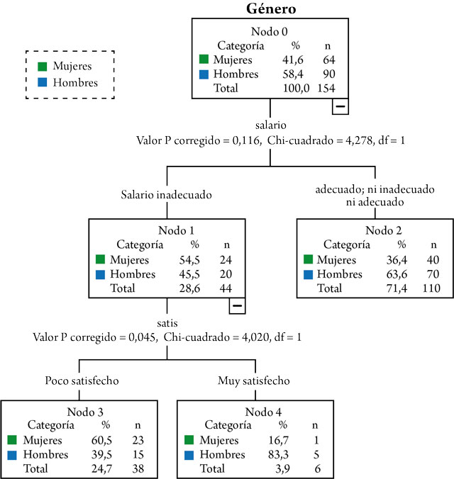 En el caso de las mujeres, ellas están mayoritariamente poco satisfechas con su trabajo (62,5%) y la variable que se relaciona con más fuerza es el salario. Únicamente aquellas que consideran que su salario es adecuado son quienes están muy satisfechas en su trabajo (75%). Las que creen que su salario no es ni adecuado ni inadecuado y que es inadecuado están poco satisfechas laboralmente; estas últimas son casi la totalidad del nodo, pues un 95,8% de las mujeres poco satisfechas creen que su salario es inadecuado, lo cual clarifica la existencia de este perfil.