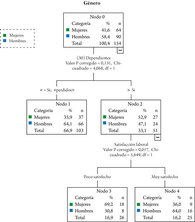 En el ámbito de la comunicación y las relaciones públicas, se aprecia que la tenencia de hijos o dependientes es un factor determinante para la satisfacción laboral e índice en el nivel de estrés de las mujeres profesionales. En este árbol predictivo 3 (Figura 4) la variable del nodo inicial es género y se divide partiendo del hecho de tener a cargo hijos o personas dependientes. Se observa cómo el nodo inicial se divide en ambas ramas por el hecho de tener responsabilidades familiares. Sin embargo, el nodo más feminizado (52,9%) se relaciona con la variable de satisfacción laboral, lo cual evidencia dos perfiles. Los hombres con responsabilidades familiares, es decir, con tenencia de hijos o personas dependientes a su cargo, están satisfechos con su trabajo (64%), mientras que las mujeres con responsabilidades familiares están poco satisfechas con su trabajo (69,2%). Estos perfiles, junto con la revisión bibliográfica, apuntan a que son principalmente las mujeres quienes se ocupan del cuidado de las personas dependientes e hijos.