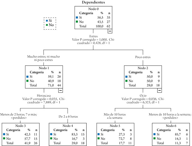 En el árbol predictivo 4 (Figura 5) solo se tienen en cuenta los casos de la muestra de mujeres profesionales de la comunicación. El nodo inicial del árbol es la tenencia de personas dependientes e hijos a cargo, donde el 56,5% de las mujeres tiene responsabilidades familiares a su cargo, mientras que el 43,5% no tienen hijos o personas dependientes a su cargo. Esta variable se relaciona fuertemente con el estrés y genera dos nodos: poco estresadas y muy estresadas. En el caso de las mujeres que se sienten poco estresadas, el árbol se divide por el tiempo semanal de ocio, dilucidando que las mujeres poco estresadas que tienen más tiempo de ocio, es decir, más de 10 horas semanales, son aquellas que no tienen hijos o dependientes a su cargo (72,7%). Por el contrario, aquellas que menos tiempo de ocio tienen son quienes poseen personas dependientes o hijos a su cargo (85,7%).