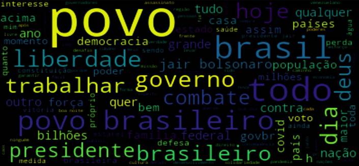 A Figura 1 evidenciou as palavras mais utilizadas nos tuítes de Jair Bolsonaro com destaque para a palavra “povo - ideia central que nos motivou a realizar este trabalho -, seguida das palavras “liberdade”, “Brasil”, “governo” e “trabalhar”. Isso nos revelou que o contexto do uso das palavras mais frequentes remete à personificação de entes que compõe o governo e a governança do então presidente, e não são rigidamente conectados a fatos objetivos da população. Conexão mais direta com a realidade vem quando Jair Bolsonaro se opõe às medidas de contenção da pandemia da covid-19. Uma análise específica para o uso de Deus não remete à religiosidade, mas à justificativa de sua posição, seus objetivos e suas ações.