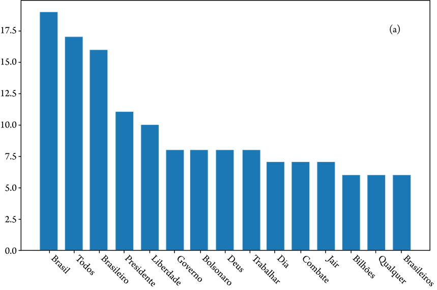 A Figura 2 evidencia a contagem exata das 15 palavras mais frequentes, das quais Brasil, todos e brasileiros têm um destaque maior. Os termos “governo”, “Jair”, “Bolsonaro”, “Deus” e “trabalhar” aparecem aproximadamente com a mesma frequência. Paralelamente à análise semiquantitativa, realizamos a leitura dos textos para contextualizar as postagens e verificar nelas a inserção desses termos frequentes.