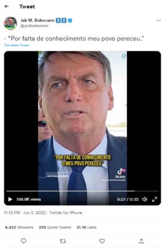 Embora a ideia de povo esteja associada à redução da complexidade, um tuíte23 analisado chama a atenção porque tenta unificar e atenuar quaisquer diferenças na categoria “povo”, apresentando uma ideia estandardizada e nada plural do que vem a ser a população brasileira. O tuíte publicado em 1º de maio de 2022, data comemorativa ao Dia do Trabalhador no Brasil, busca evidenciar a ideia de um povo unido. Essa afirmação feita no tuíte de Jair Bolsonaro pode ser facilmente contestada quando confrontada com as declarações do então presidente da República relativas aos povos originários, à orientação sexual, a questões de gênero, étnicas e raciais.