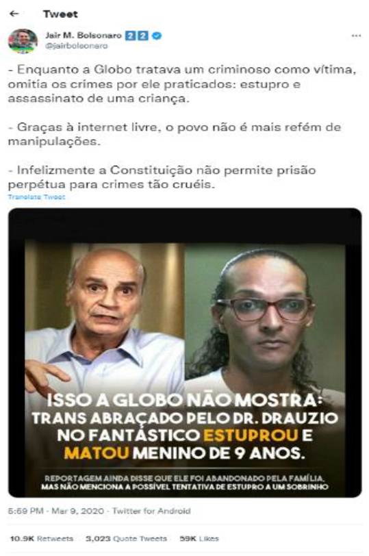 Uma outra observação importante em nossa análise é o fato de que os tuítes de Jair Bolsonaro privilegiam a formação de uma “bolha informacional” nas redes oficiais24e25 do, à época, presidente da República em contraposição à mídia de referência que ele insiste em descredibilizar, buscando eliminar os filtros e ampliar o alcance de suas mensagens nas redes digitais. O link do vídeo, com mais de 136 mil visualizações, leva ao canal de Jair Bolsonaro no YouTube, com mais de 6,3 milhões de inscritos, durante o período da pesquisa. Essa ação gera um processo de retroalimentação da informação26 junto aos seguidores com fonte nas redes sociais de Jair Bolsonaro e um afastamento desses seguidores do que podemos chamar “imprensa ou mídia de referência”, em que, para ser publicada, a informação precisa atender e cumprir critérios de noticiabilidade e rigoroso processo de apuração. A transferência de responsabilidade - quando essa é considerada por Jair Bolsonaro como negativa - está presente em seus tuítes sobretudo ao longo da pandemia da covid-19 com as ações restritivas orientadas pela Organização Mundial de Saúde (OMS) para mitigar as consequências da circulação do vírus. Em nossa amostra, destacamos dois tuítes27 que evidenciam a transferência de responsabilidade a governadores e prefeitos, principalmente àqueles que seguiam mais rigorosamente as orientações sanitárias e, portanto, desafetos de Jair Bolsonaro. Um dos tuítes28 acusa gestores públicos de serem autoritários e restringirem a liberdade do povo.
