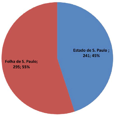 Ao final da pré-seleção, obtivemos um total de 536 matérias (N=536) do tipo b, distribuídas entre os dois jornais segundo o Gráfico 1 abaixo. Todas as análises subsequentes trataram apenas das matérias do tipo b.